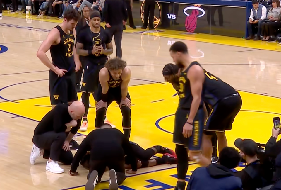 第三节还剩下7分多钟的时候,巴特勒和小米切尔争抢球权时倒地,随后巴特勒痛苦地捂着自己的膝盖,之后勇士立刻叫暂停,队医、队友和主帅科尔都上前查看其伤势。巴特勒在地板上躺了很久,才在队友的搀扶下,返回更衣室接受进一步治疗。他的右脚无法承重,离场前,顽强的巴特勒挤出了令人心酸的笑容。