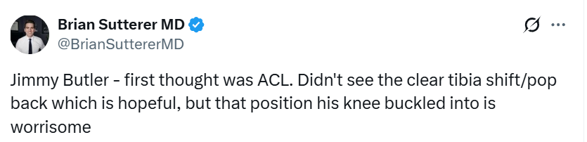 医学专家Brian写道:“巴特勒这次受伤,我第一反应就是前交叉韧带出了问题。虽然没看到明显的胫骨移位和复位回弹的迹象,这算是个万幸的信号,但他膝盖弯折时的那个角度,实在让人揪心。”